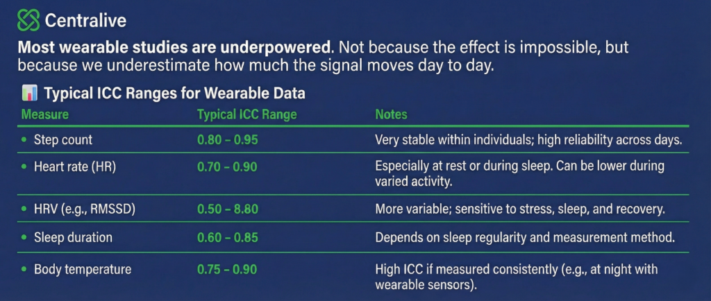 The following table shows that different wearable outcomes have very different typical ICC ranges. Step count and resting heart rate are often highly stable within individuals. HRV and sleep measures fluctuate much more. High ICC means repeated days look similar. Low ICC means each day adds genuinely new information.