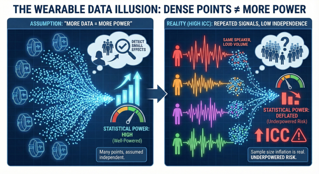 In reality, most wearable studies are underpowered. Not because the effect is impossible, but because we underestimate how much wearable signals move from day to day.