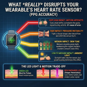 Wearable heart rate and HRV sensors are often blamed when data looks wrong, but real world errors are dominated by motion and contact instability. Across everyday use, movement overwhelms the pulse signal far more than skin tone or sunlight. The figures below show why HR and HRV break down in motion, and how modern multi wavelength PPG systems are designed to reduce that damage.