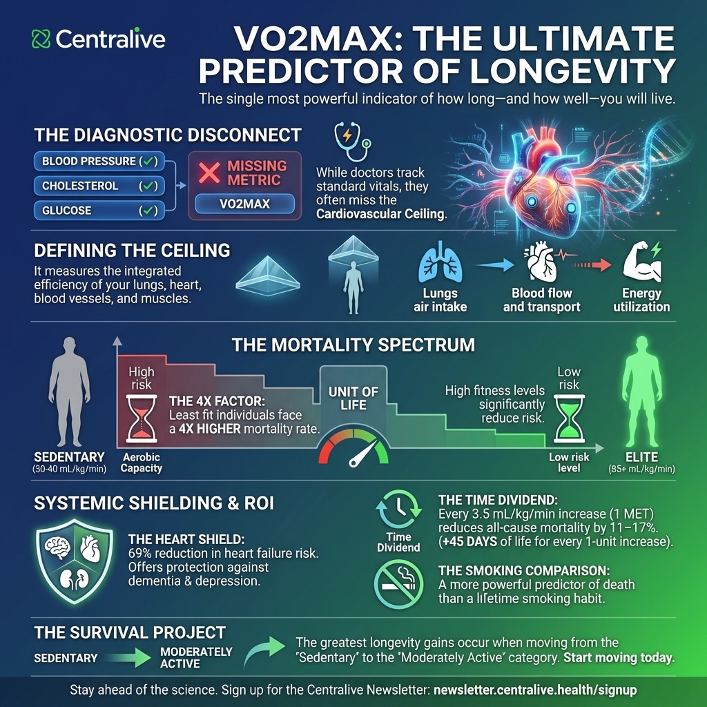 There is a measurement that exercise physiologists have known about for decades, that major medical bodies have been quietly pushing into mainstream medicine, and that a growing body of research now regards as the single most powerful predictor of how long you will live. It is not your cholesterol. It is not your resting heart rate. It is not your BMI. It is your VO2max — the maximum rate at which your body can consume oxygen during intense exercise — and the data behind it are, by any reasonable standard, extraordinary.