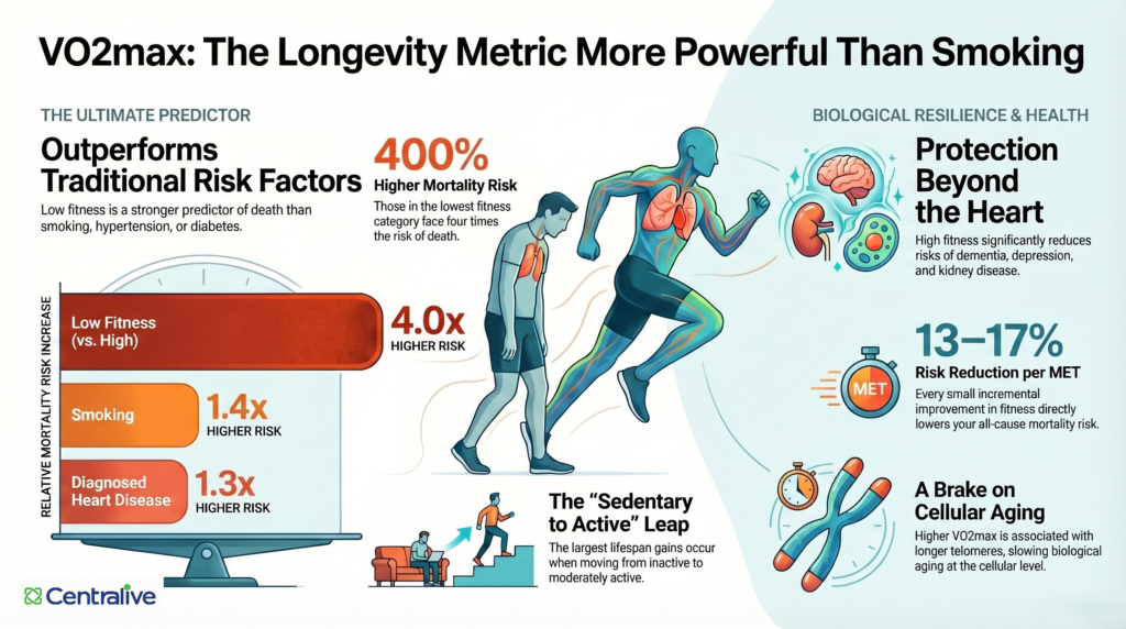 In 2016, the American Heart Association published a landmark scientific statement making a formal argument that cardiorespiratory fitness — measured by VO2max — should be treated as a clinical vital sign, routinely assessed alongside blood pressure, cholesterol, and blood glucose. The statement drew on decades of large-scale epidemiological data and made a striking claim: low cardiorespiratory fitness is not merely associated with poor health outcomes — it is a more powerful predictor of mortality risk than smoking, hypertension, high cholesterol, or type 2 diabetes.