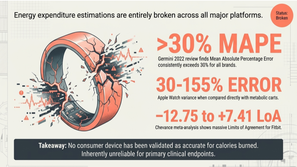 A widely cited systematic review by Germini and colleagues at McMaster University, published in the Journal of Medical Internet Research in 2022, looked at 65 studies covering 72 devices across 29 brands. Across the board, energy expenditure showed Mean Absolute Percentage Error above 30%. The authors concluded that none of the tested devices proved accurate for measuring energy expenditure. Step counts and heart rate, by contrast, performed considerably better for several leading devices.