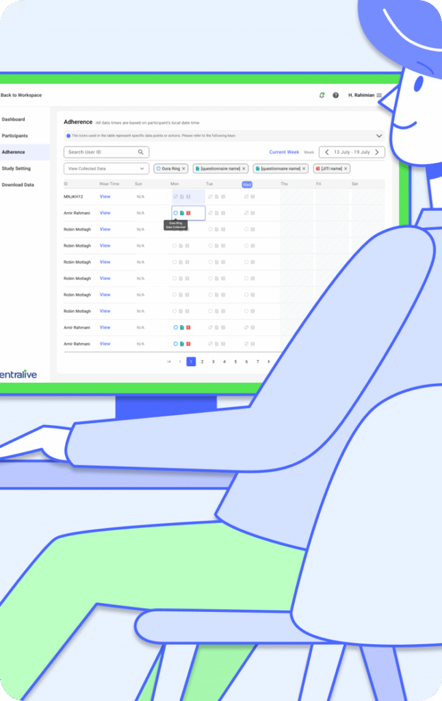 Researchers use the Centralive Dashboard to monitor study progress in real-time and analyze collected data.